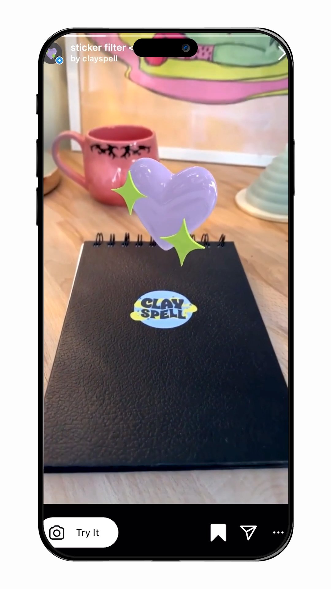 I created this interactive Instagram filter for my Clay Spell customers as part of the unboxing experience. Each order included a branded sticker, which customers could scan to activate the filter. Once scanned, a 3D heart in Clay Spell’s signature colours would appear through the Instagram camera, adding a playful and shareable digital moment to the physical packaging.